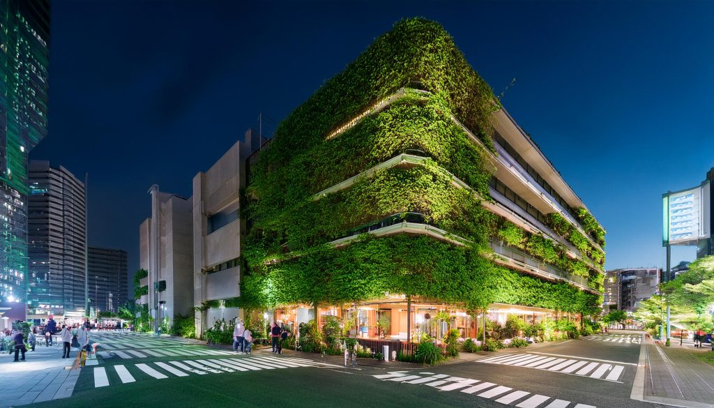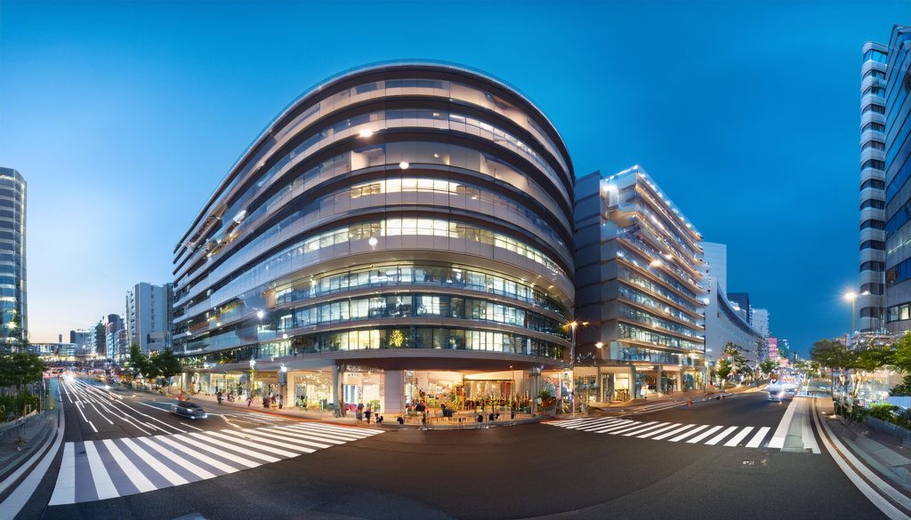 地方都市の市街地街角に建つ複合商業施設